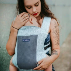 De draagzak is ergonomisch en zorgt daarom voor een goede ontwikkeling en houding van je kindje. Je kindje zit in de draagzak naar je toe gericht in een kikkerhouding, die de ruggengraat perfect ondersteunt. De draagzak is zowel voor je te dragen (op de borst) of achter je (op de rug). Daarnaast zijn de schouderbanden recht of kruislings te dragen.Â